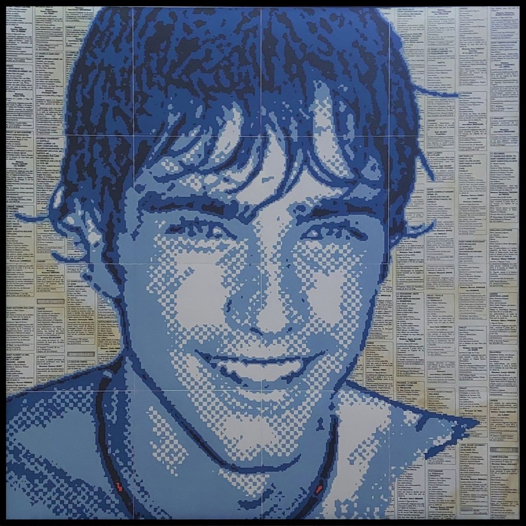 L’ensemble constitue une Vanité, thème qui m’est cher, en ce que le visage radieux a été incrusté sur un fond d’avis de décès.