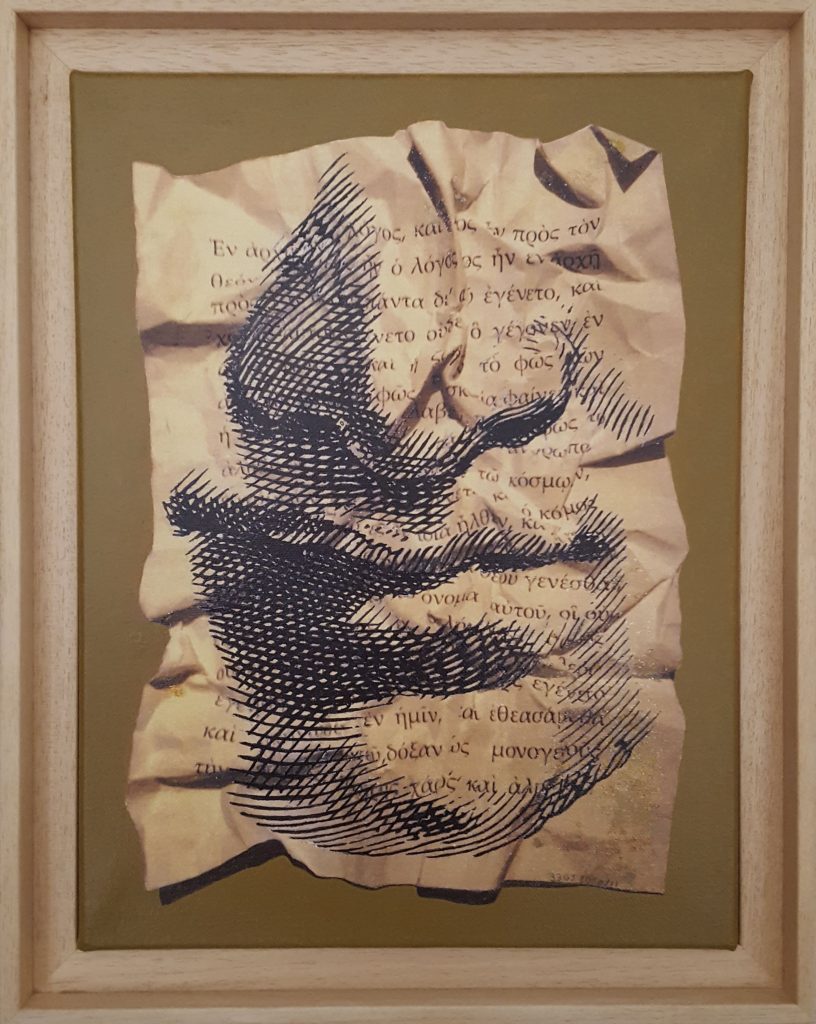 Et Il dit… Ἐν ἀρχῇ ἦν ὁ λόγος, au Principe était la Parole créatrice, le Dabar. (Prologue de l’évangile selon saint Jean.) Acrylique sur toile.Transfert du texte.Encre. Format 40×30