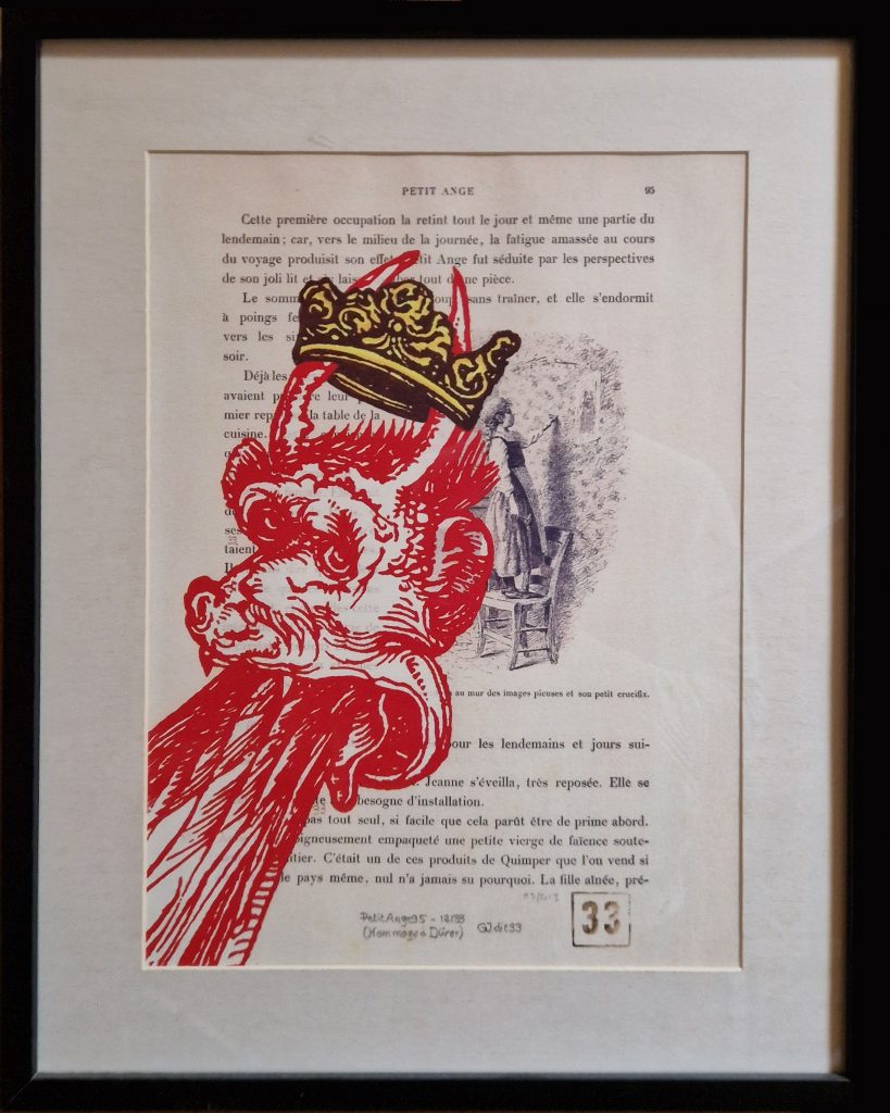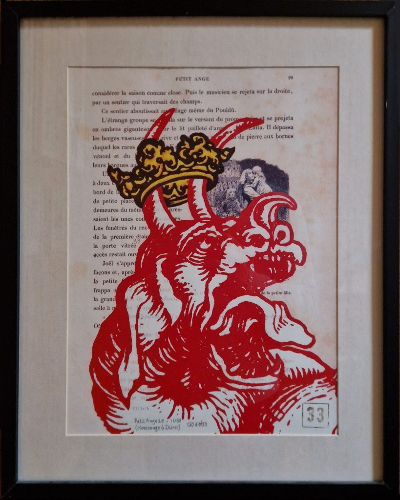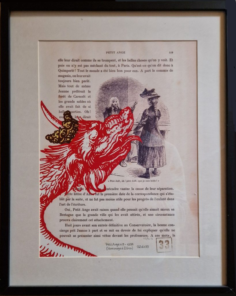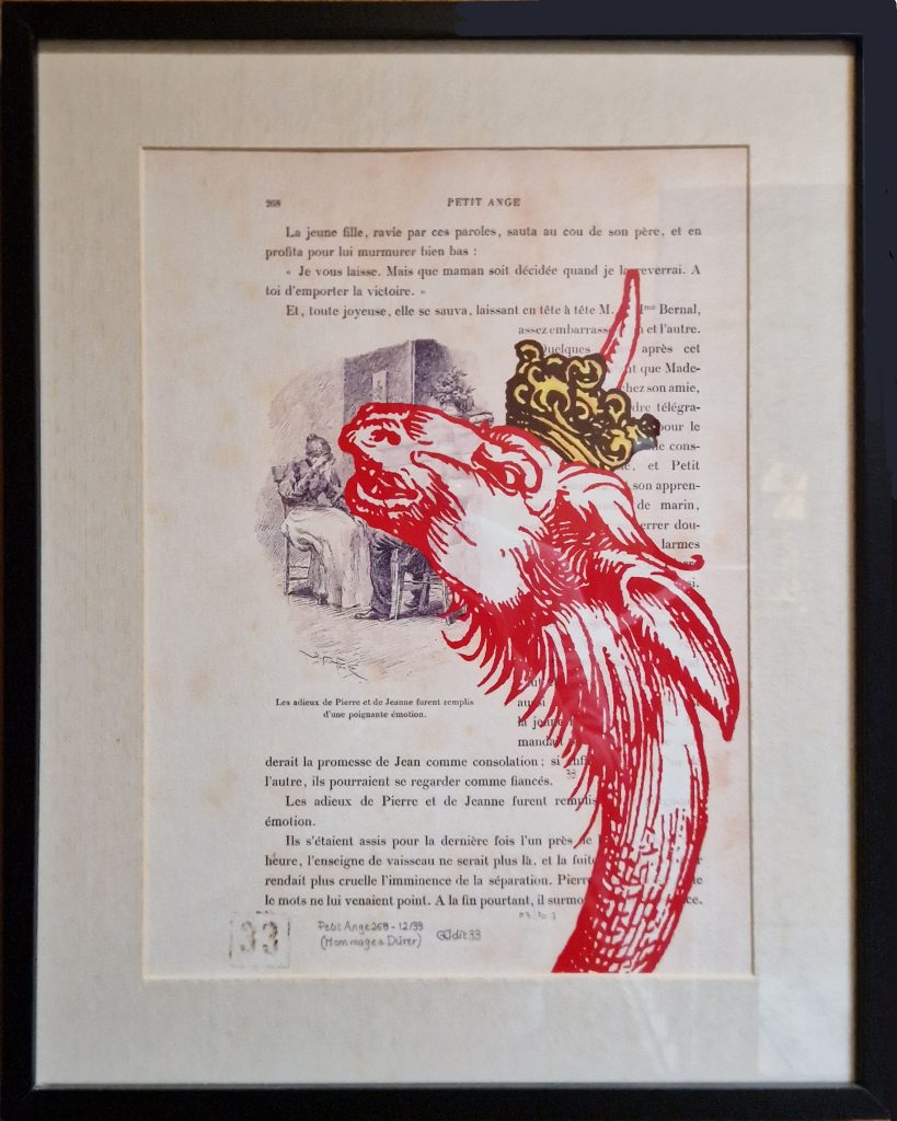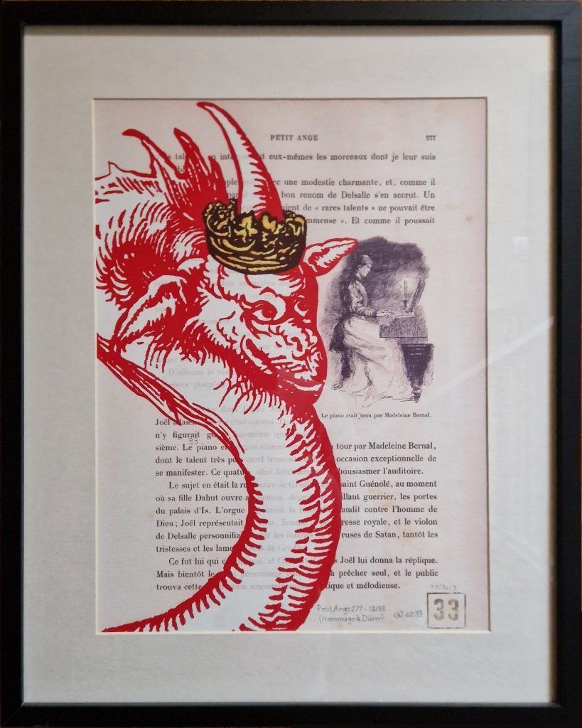 Même s’il était très abîmé, je l’ai récupéré et je me suis amusé à reproduire dessus, en rouge, les 7 têtes du Dragon de l’Apocalypse de Dürer en tachant de les faire coïncider avec les illustrations et le texte.
